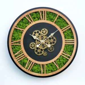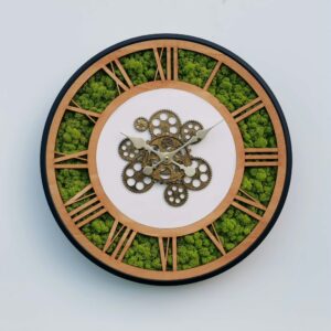 Nástěnné hodiny doplněné několika druhy stabilizovaného mechu. Dubové dřevo je ošetřeno teakovým olejem.