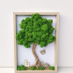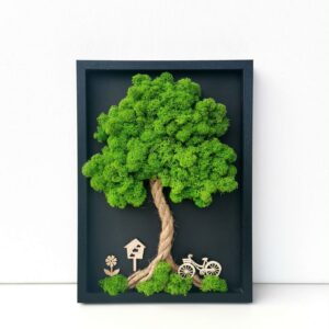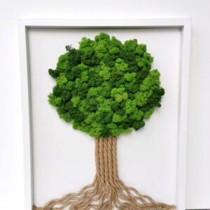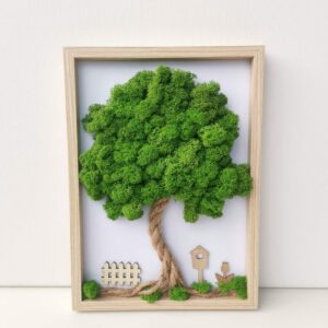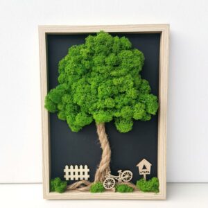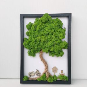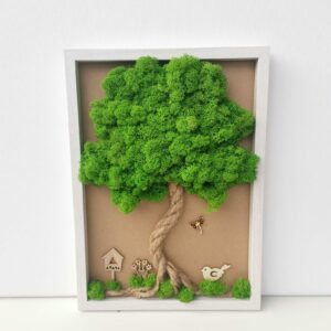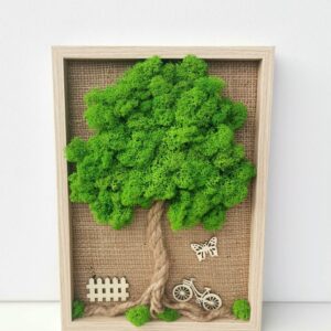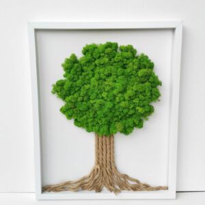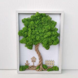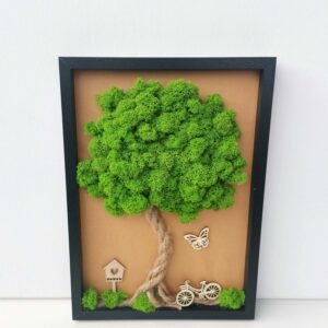 Mechový obraz je vyrobený z kopečkového a a a tmavě zeleného sobího mechu.