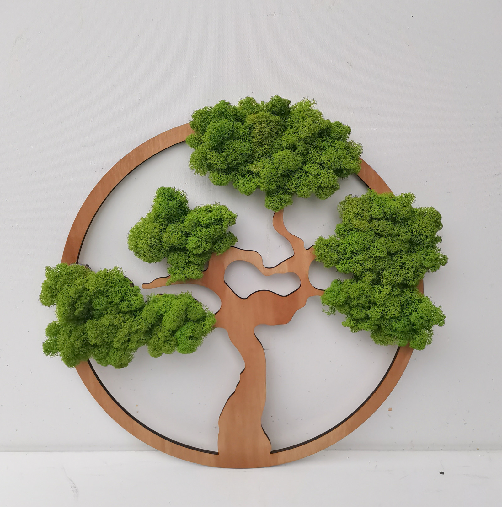 Strom je vyrobený z přírodních materiálů a to ze světle zeleného stabilizovaného sobího mechu a dřevěné překližky.