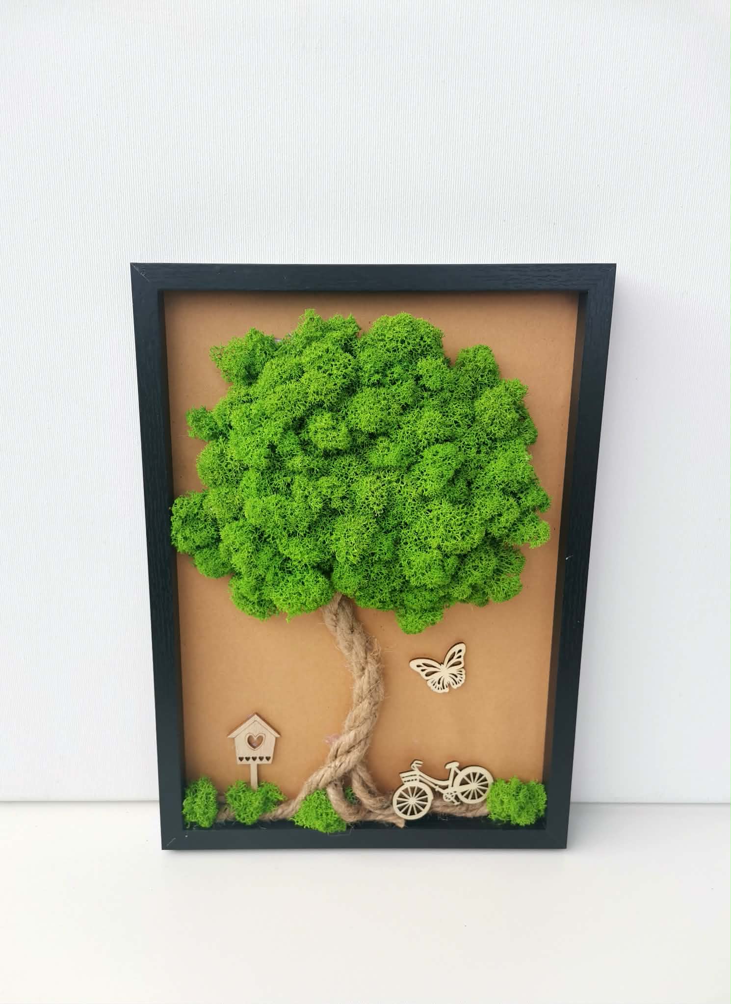 - Výhodou mechových obrazů oproti běžným rostlinám je, že můžou být umístěny ve tmavé místnosti, bez přísunu světla.