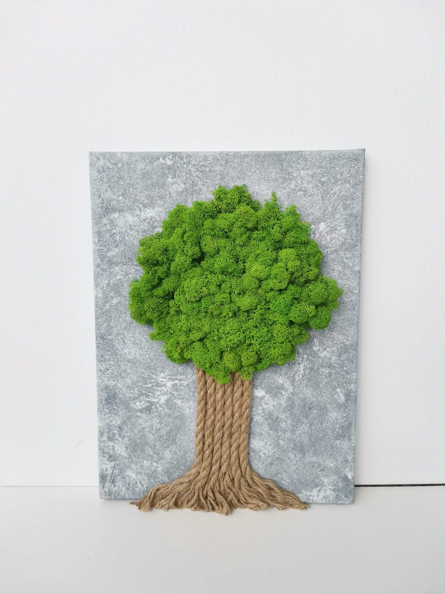 Obraz je vyrobený ze stabilizovaného sobího mechu, jutového lana a plátna.