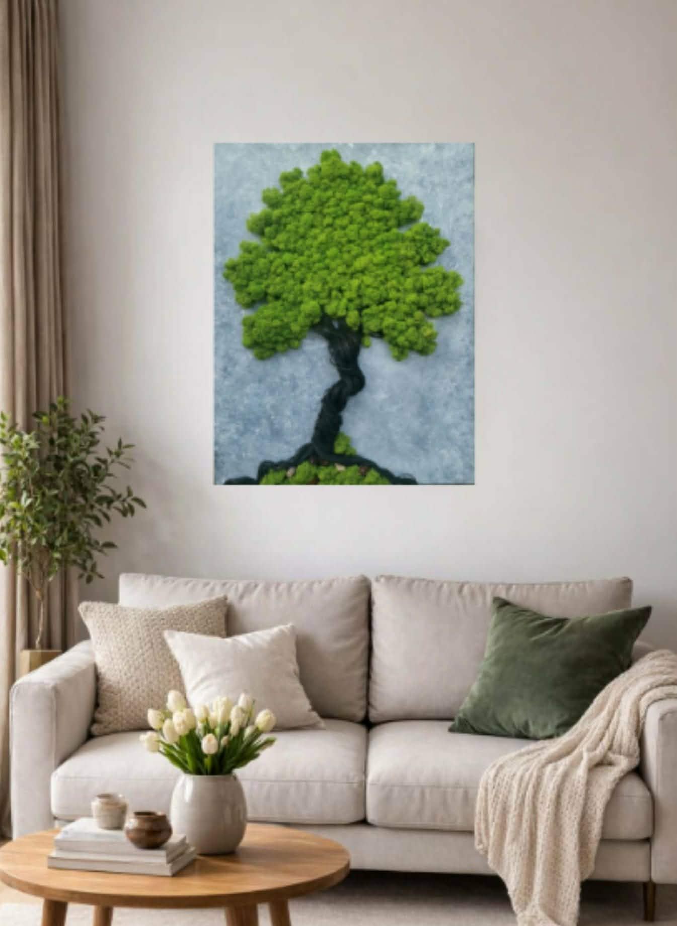- Výhodou mechových obrazů oproti běžným rostlinám je, že můžou být umístěny ve tmavé místnosti, bez přísunu světla.