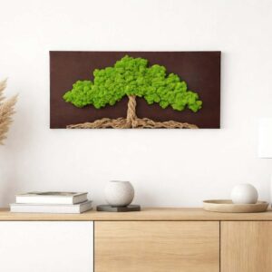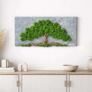 Mechový obraz je vyrobený z kopečkového a a a tmavě zeleného sobího mechu.